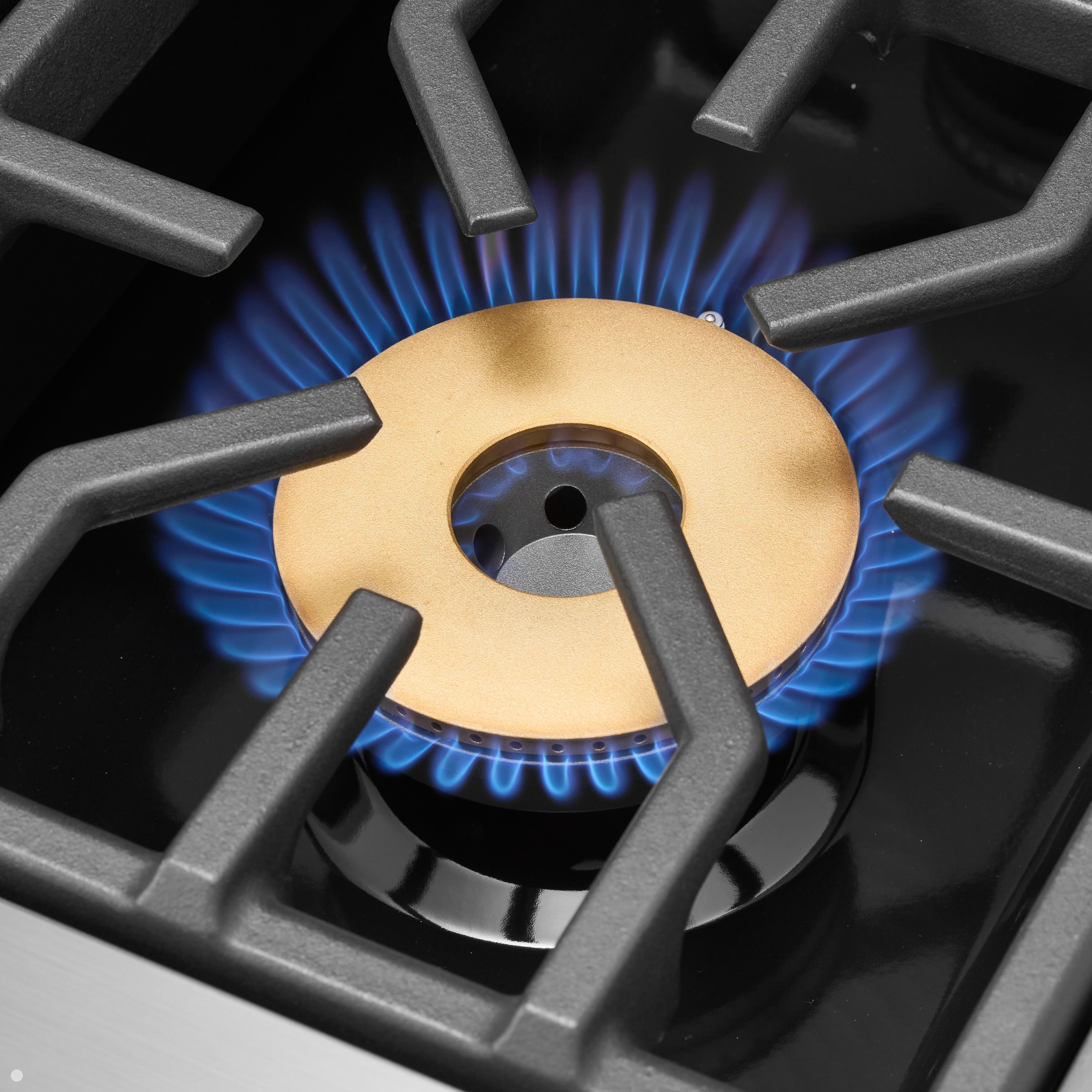 Elevated burners boast 23,000 BTUs across the front of all width configurations, with multiple 15,000 BTUs and one 8,000 BTU burner across the rear. Elevated flame ports prevent spillovers from baking on, making cleanup easy. The VariSimmer™ Setting on ALL burners provides gentle, even simmering at precisely low cooking temperatures.