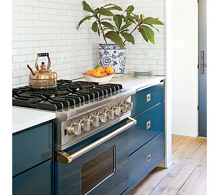"Andy had but one request: a Viking range in the Viking Blue custom color. Jen lacquered the surrounding cabinet doors to match the stove. The deep teal sparked the family room's color palette, which includes silvery grays and purples punctuated by pops of green and blue." - Story by Sandra S. Soria, Southern Living