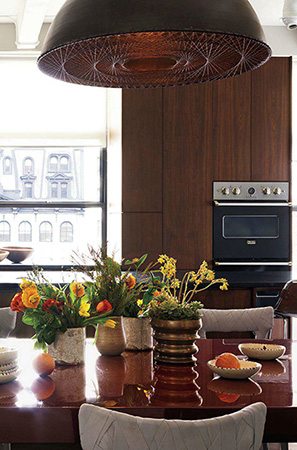 Two huge light fixtures. Each is a very aggressive steel drum with this delicate silk thread strung across the opening to serve as a light diffuser. I just love that play of masculine and feminine. It feels very modern as well.