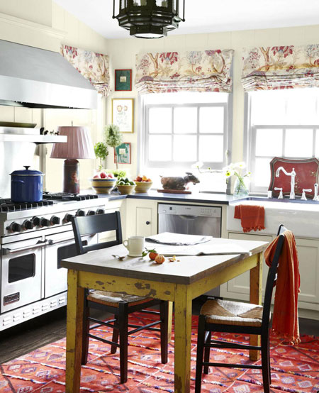 "The kitchen has a cozy atmosphere in keeping with the 1939 house. A 19th-century English farm table is paired with Crate & Barrel chairs. To warm up the space, Samperton added a flea-market rug and Roman shades in Benison's Dragon Flower. Walls and cabinetry are painted in Benjamin Moore's Ivory White. Viking stove and Vent-A-Hood hood. Cortina latern, Paul Ferrante."