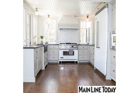 The McIsaac family transformed a 200-year-old millworker's home into an old world haven. White Viking appliances match the countertop of this farmhouse style kitchen.