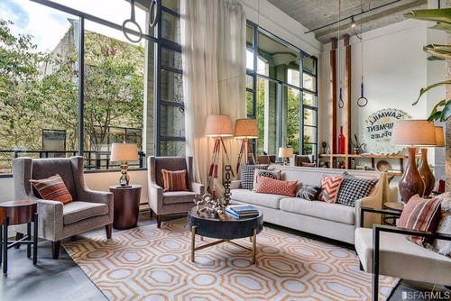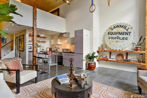 The unit is on the ground floor, which means that, technically, it is a live-work loft with a storefront that can be used to conduct business. During its rehabilitation, the building got new glass fronts in a style that melds beautifully with the cast-concrete structure.