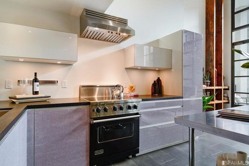 Kitchen cabinets sport back-painted glass fronts. The countertops are soapstone. Undercabinet lighting: Twicebright; range and hood: Viking