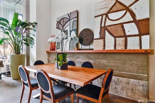 In the dining area, pieces from the homeowner’s art collection set a dramatic scene for dinner parties.