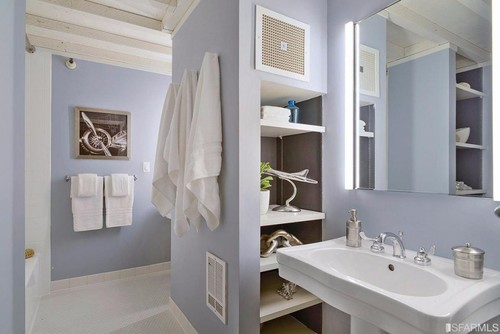 Feldon and his team saved the homeowner money by keeping the bathroom fixtures where the builder had put them. New paint, finishes and lighting personalize the space.