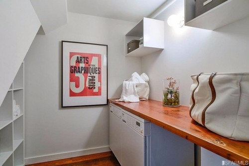 “We didn’t want to overdo it with wood and just make a wood box, so we were careful to introduce that element in various ways and small spaces to strike a balance,” Feldon says. Reclaimed wood on the counter and floor help warm up a previously cold and impersonal laundry room.