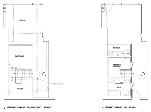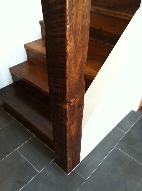 A staircase (originally made of plywood and covered in carpet) to a sleeping loft got a new look in reclaimed lumber. Reclaimed post and stairs: Heritage Salvage Exposed concrete ceilings and supports are part of the original structure. When the builders converted the manufacturing plant into lofts, they tore out everything except for these structural elements, and then they divided it into individual spaces with drywall and studs.