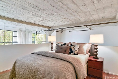The serene sleeping loft smartly juxtaposes warm a reclaimed-wood floor and a cool concrete ceiling.