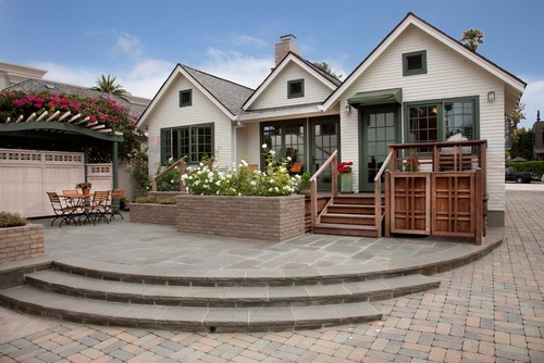 The new patio is New York bluestone; its green tint picks up on the home's Craftsman green trim. The Mangaris wood deck has Craftsman-style detailing. "We added some old-school elements, like the canvas awning, to honor 1930s style," Gatling says.