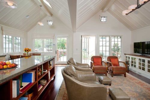 The kitchen and living room are subtly divided within the same space. This side of the kitchen island has cherry bookshelves for the living room. Gatling opted not to put a sink in the island so that it would not look as though it belonged to the kitchen more than to the living room.