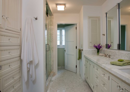 Beadboard cabinets stay in keeping with the period. Matching the floor and backsplash tiles helped streamline the room. The counters are Alba Chiara marble.