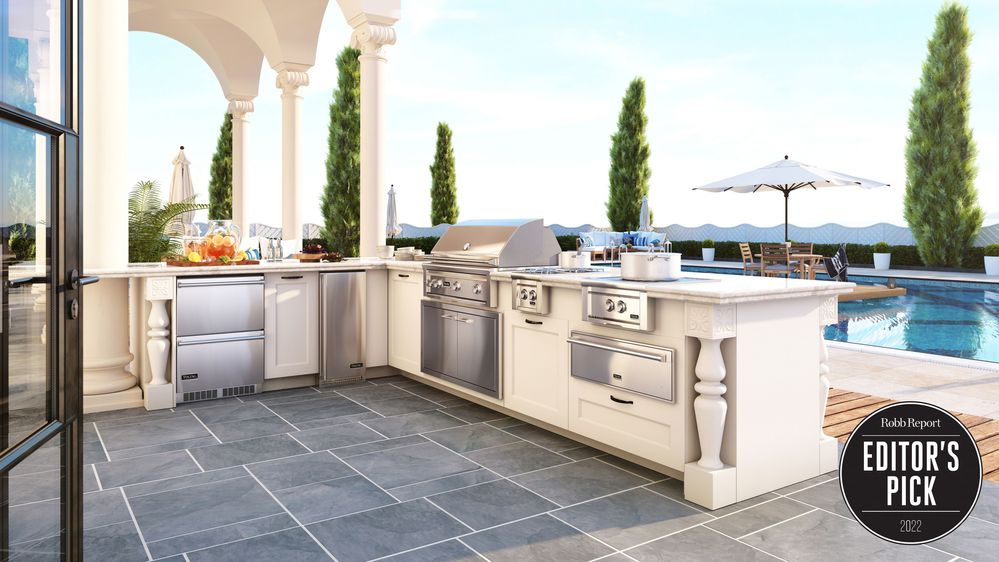 Robb Report goes on to name some of the products Viking offers, such as the massive freestanding or built-in grills outfitted with multiple cast brass burners (rated at 25,000 BTUs each and guaranteed for a lifetime), searing burners, rear infrared burners, and dual-position rotisseries with three-speed motors. The outdoor space can be complete with a hood to give off a "celebrity-chef-on-his-day-off vibe."
