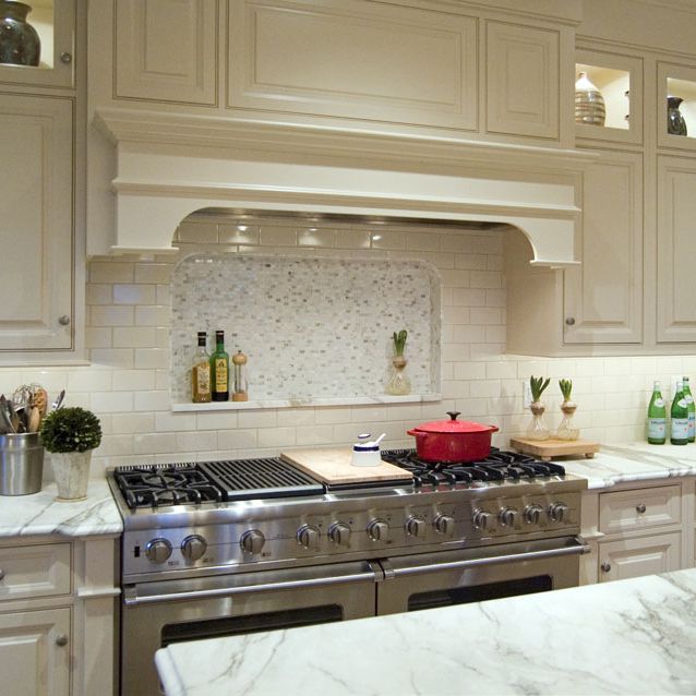 The kitchen was relocated to where the butler’s pantry and sun porch previously resided, and it was opened up to the rear yard. To do so, the design team removed a thick masonry wall to create one large floor plan. New windows and doors were installed as well as built-in cabinetry. The cream-colored cabinetry, which was custom designed Dave Stimmel of Stimmel Consulting Group, features beautiful woodworking details, sections of glass-front doors, and in-cabinet lighting to highlight colorful pottery. These pops of color add a touch of added interest against the sophisticated palette of creams and soft browns provided by the cabinetry, marble countertops, and wood flooring. A coffered ceiling, which complements the cabinetry in color and style, cloaks a steal support beam that was installed in lieu of the removed wall. A concealed glass pocket door provides separation between the kitchen and family room when desired.