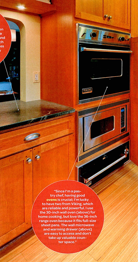 "Since I'm a pastry chef, having good ovens is crucial; I'm lucky to have two from Viking, which are reliable and powerful. I use the 30-inch wall oven for home cooking, but love the 36-inch range oven because it fits full-size sheet pans. The wall microwave and warming drawer are easy to access and don't take up valuable counter space."