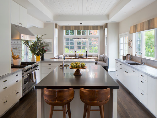 But not every meal can be made under a blue sky. Inside, the kitchen was reconfigured to suit the family. Quinn Morgan of Laura Martin Bovard Interiors conceived a layout that would allow people to work and spread out. “When you have three kids, you will often have their three friends in the house,” Bovard says. “Since the kitchen is a household hub, it’s helpful to have room for working and gathering for that many people.” The new kitchen features more countertop space for prep work and serving. Bar stool seating at one end of the island and along the peninsula between the kitchen and the banquette allows for gatherings of two or four.