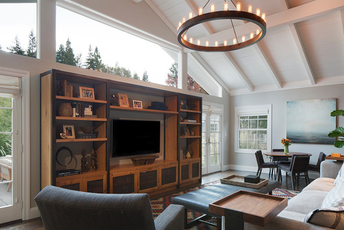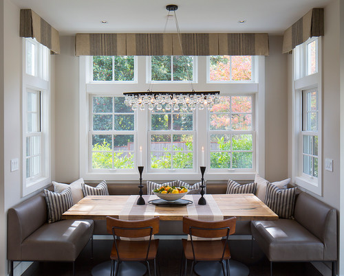 For family dinners, a three-sided banquette is just outside the kitchen. The table is custom, crafted from boards salvaged from a winery. The light fixture is see-through, so no light or views are blocked. “There’s a high-low mash-up in this house,” Bovard says. “I find that no matter how much clients have to spend, they appreciate a few well-chosen, cost-effective items. The light fixture is from Ochre, and the chairs are West Elm.” The designer says paneling was used on the ceiling and cabinets to create a casual and cheerful effect.