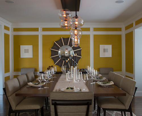 The yellow wall covering and white moldings were already in place when Bovard was hired. She gave the room a more modern vibe with midcentury-style chairs and a modern chandelier.