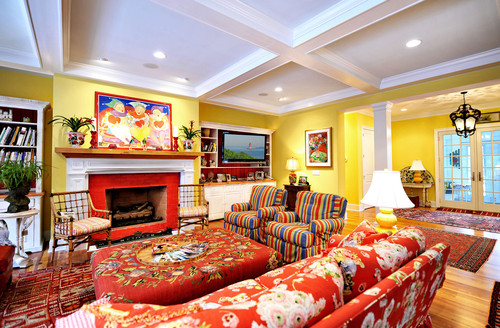 Designer Matty Adler says that the interiors were influenced by the homeowner's colorful, bubbly personality. He describes the home's style as being "country whimsy." Here, in the family room, the homeowner painted the red fireplace surround herself. The bright and cheery yellow wall color became the main "neutral" color for the entire home.