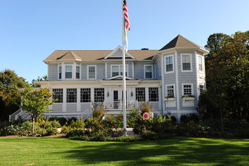 Built in 2009, the 5,600 square-foot home is located in an exclusive community nestled in between a canal and the Atlantic Ocean. The house is located on the the same site as the homeowners' previous beach house, which was torn down. The Baltimore-based couple wanted a new home large enough to accommodate their three grown children and their families, including several grandchildren. With the wife leading the design, this house has become a happy hub for summer vacations. Interesting facts: The lattice work on the front porch was re-created to match the lattice that the homeowner designed herself for the previous beach house. Even with its overall historic style, this house has green features, including geothermal and solar capabilities.