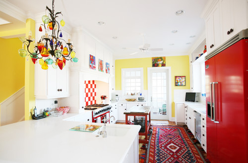 The homeowner, an avid painter/artist, is not afraid of color. She wanted to fill her home with colorful art and vivid hues on the walls. In fact, she originally requested a red kitchen but at the suggestion of designer Matty Adler, opted for striking red appliances instead. "I knew how much color was going into the house," says Adler. So for balance, he chose white for the cabinets, counter tops and trim. In addition, the Viking appliances in Racing Red gave a pop of color to the kitchen without overwhelming the space.