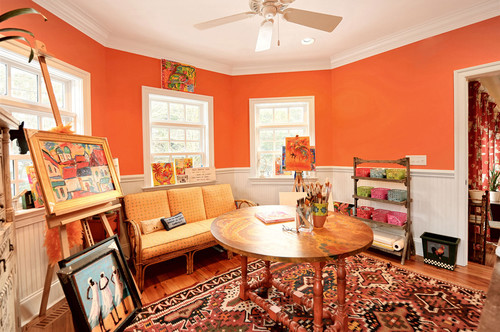 The home's color palette was also influenced by the homeowner's artwork and works by other local artists. In this art-filled parlor, you'll also find one of many beautiful area rugs that are throughout the home. All of the hardwood flooring is reclaimed pine from an old factory in Chicago. Orange was also used for the powder room which showcases even more art.