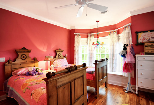 The homeowner selected a deep, saturated pink for the wall color in this children's bedroom. This is just one of the rooms for her grandchildren: another is painted green, and there are bunk beds in the boy's room, which is painted red.