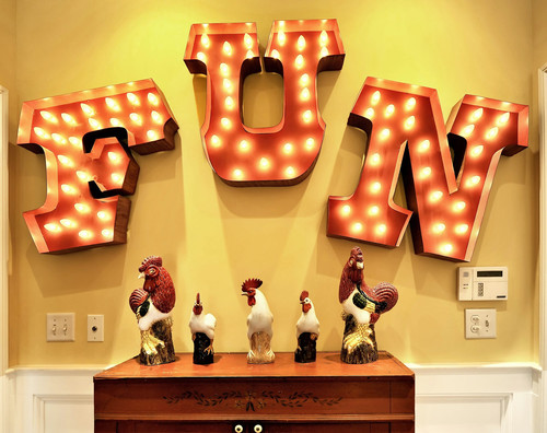This spectacular vignette greets visitors at the top of the stairs. The homeowner's collection of roosters is proudly displayed beneath carnival letters that spell out the word, FUN. When it comes to this amazing home, that pretty much sums it up!