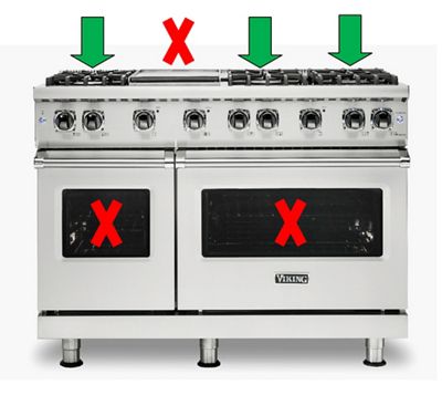 Consumers CAN CONTINUE TO USE the top surface burners of the range, indicated by the green arrows, but SHOULD NOT USE the griddle and ovens, indicated by the red Xs.