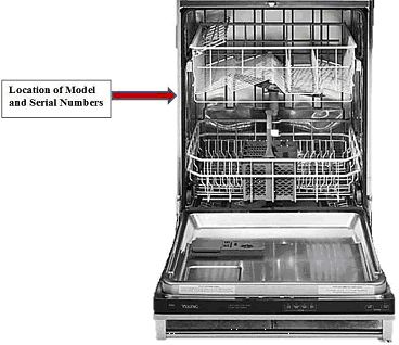 - Please locate the model and serial number of your dishwasher which are located on the identification plate mounted on the left side of the dishwasher door opening