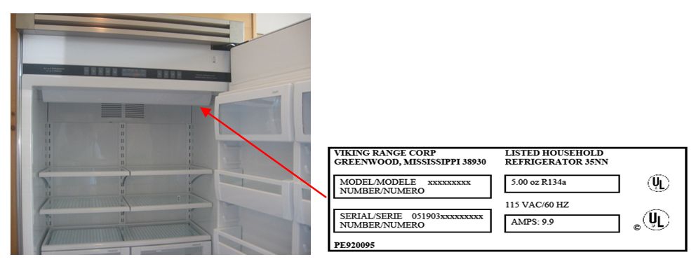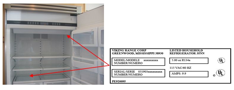 Description: This recall involves Viking 42-inch and 48-inch built-in side-by-side refrigerator freezers with in-door water and ice dispensers. The recalled refrigerator freezers come in a variety of colors, stainless steel or a custom finish. They were manufactured between October 2012 and May 2013 and have the model numbers listed below. The first six numbers in the serial number are the manufacture date of the unit in MM/DD/YY format. Both sizes of refrigerator freezers have a serial number/date code range from 101712 through 052913. The model and serial numbers are located on the ceiling of the interior of the refrigerators.
