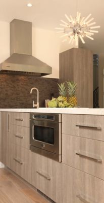 To anchor the "cooking" side of the room, full height cabinetry surrounds the Viking range and "frames" it while an oversized hood fan adds drama to the space. Because the Viking appliances were in view, porcelain with metallic finishes in grays were chosen as a back splash to complement the appliances and the variation of grain in the gray wood tones of the cabinetry. The island includes a microwave drawer as opposed to a built in to not interrupt the clean cabinetry.